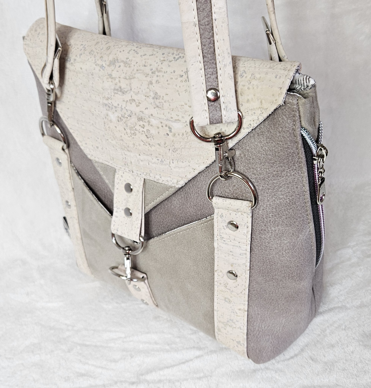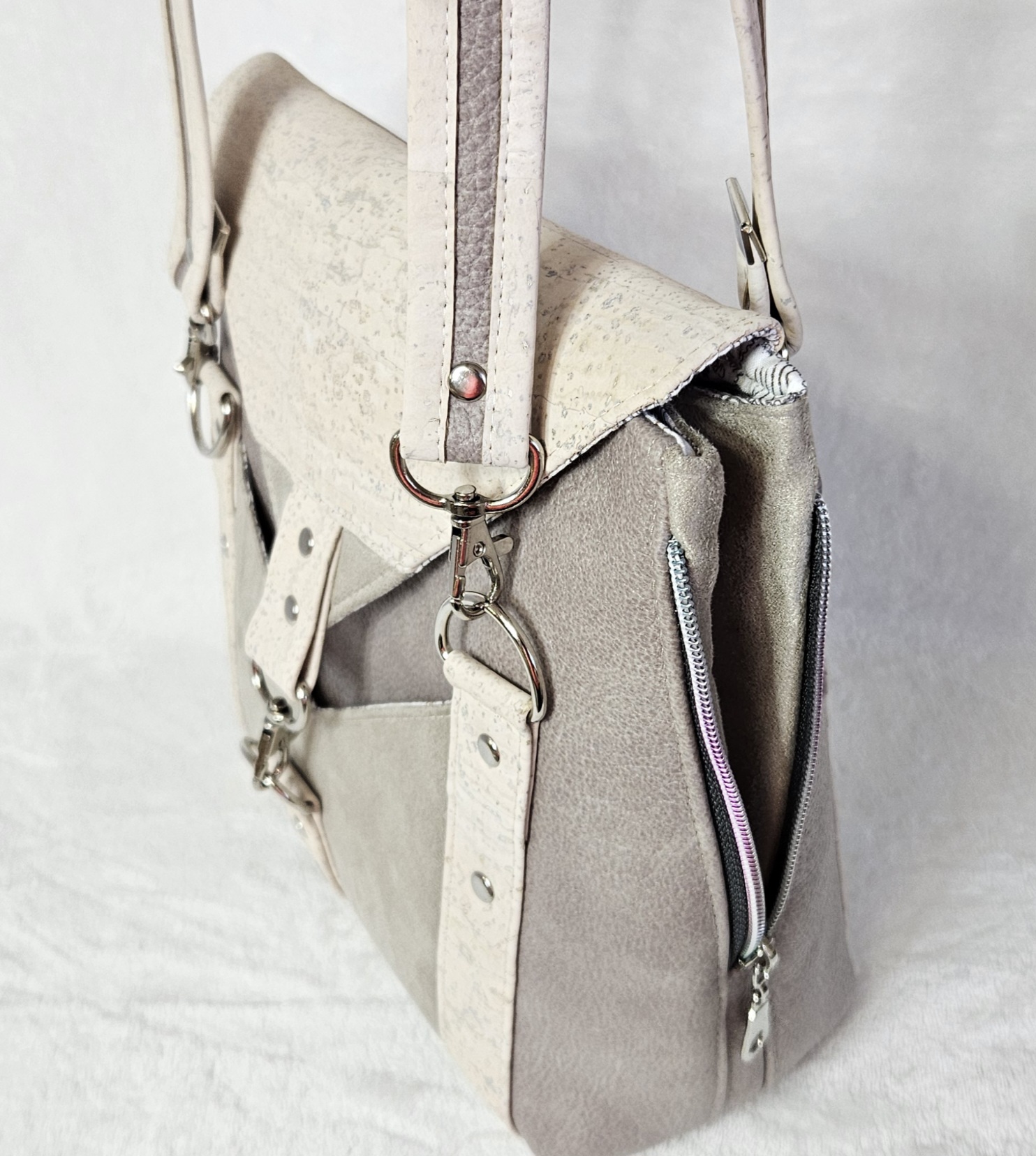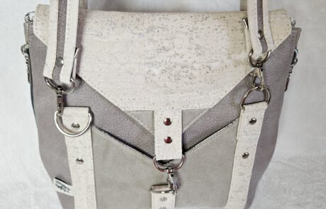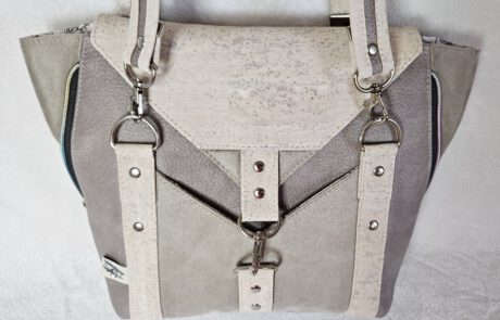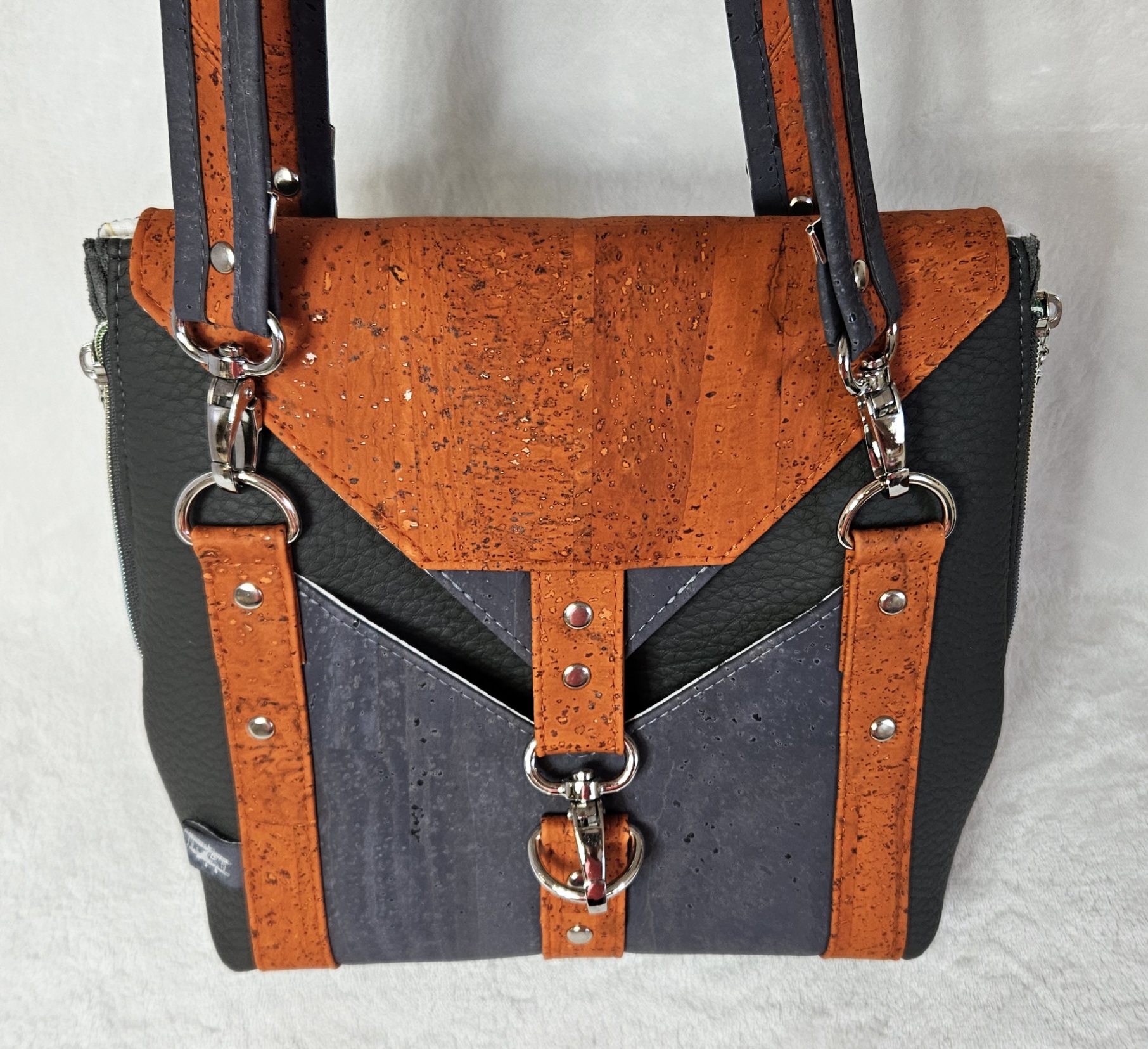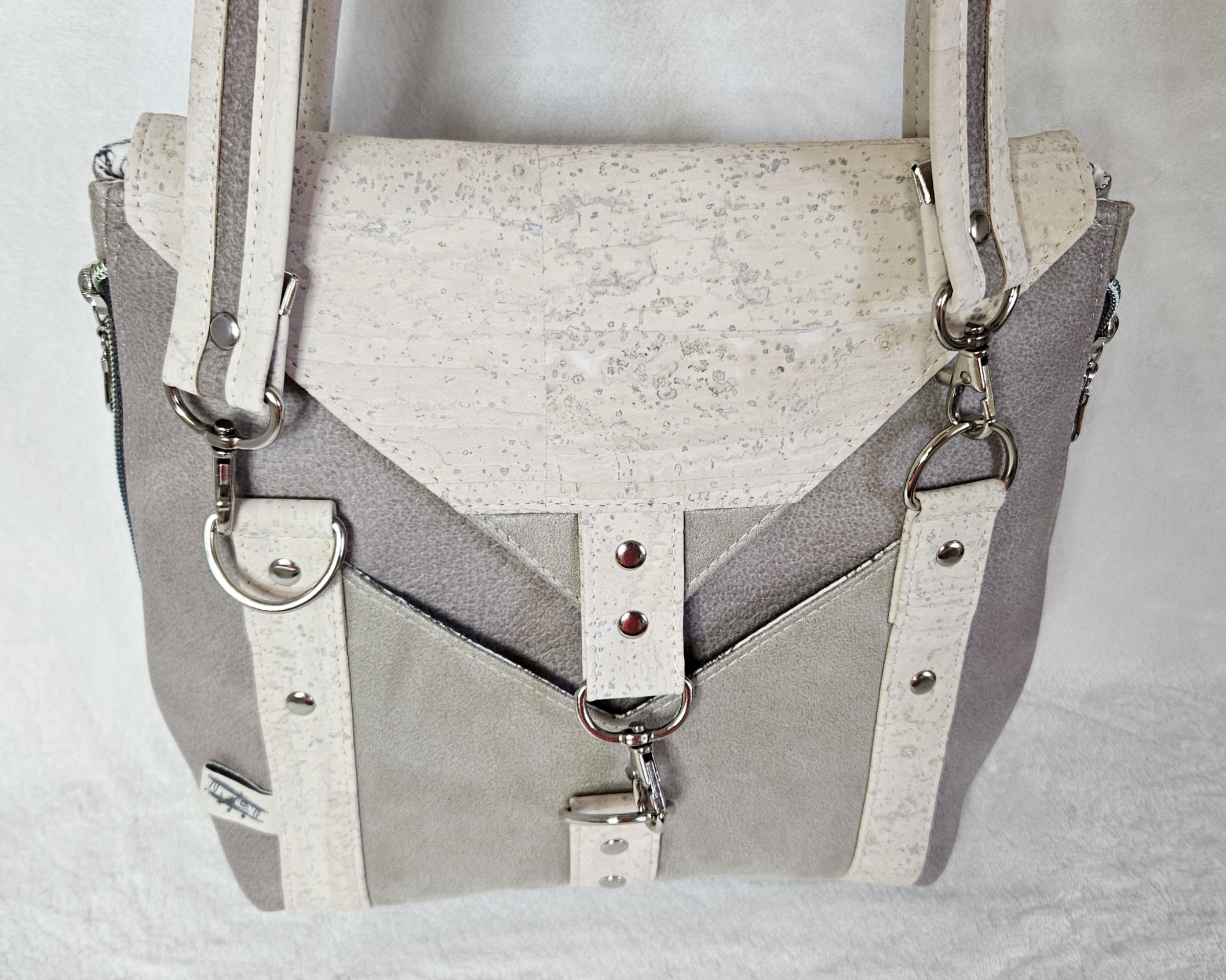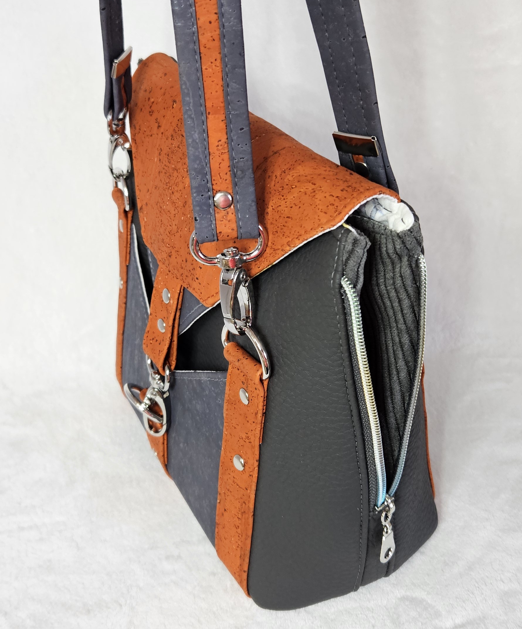 Eine Kombi aus Canvas und Korkstoff. Mit einer Reißverschluss-Blende und einem Magnetverschluß an der Taschenklappe.