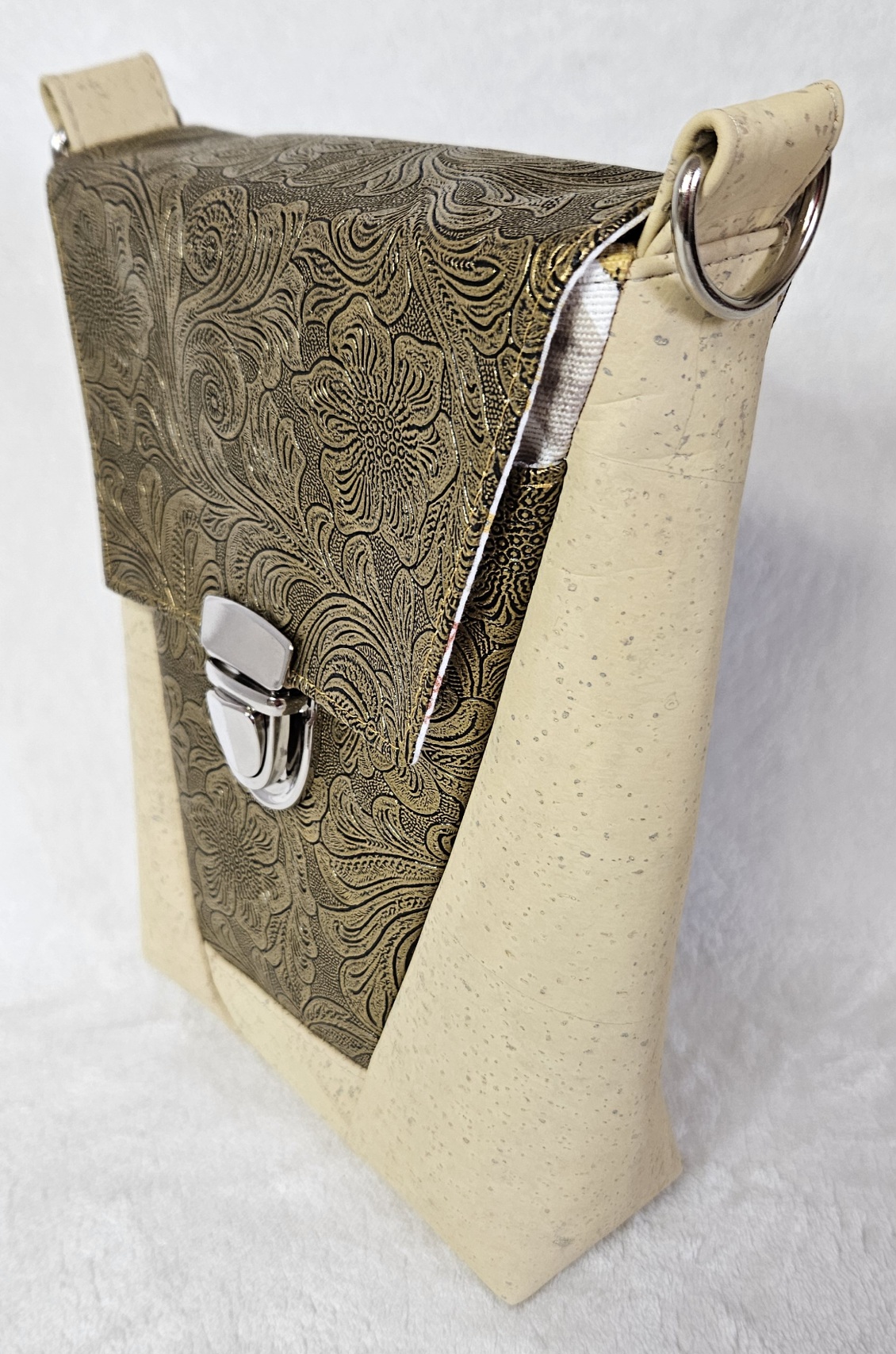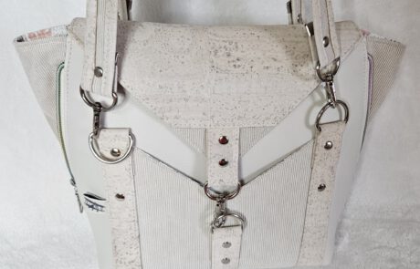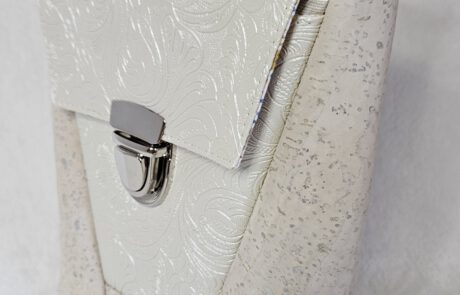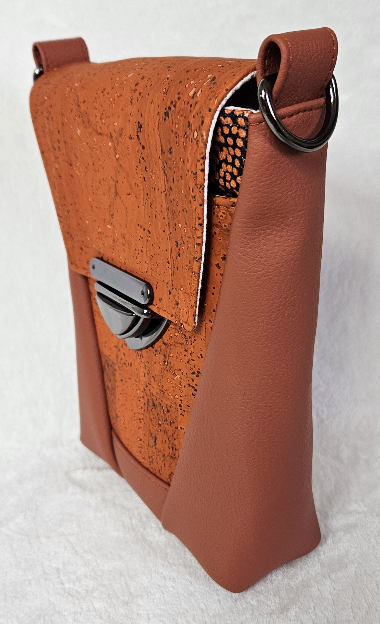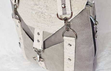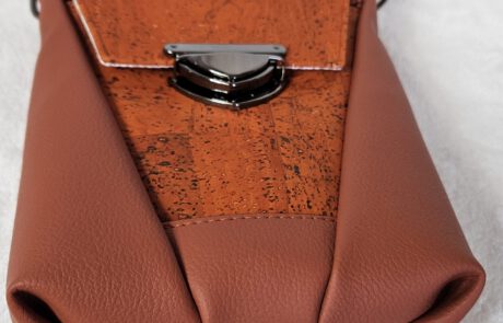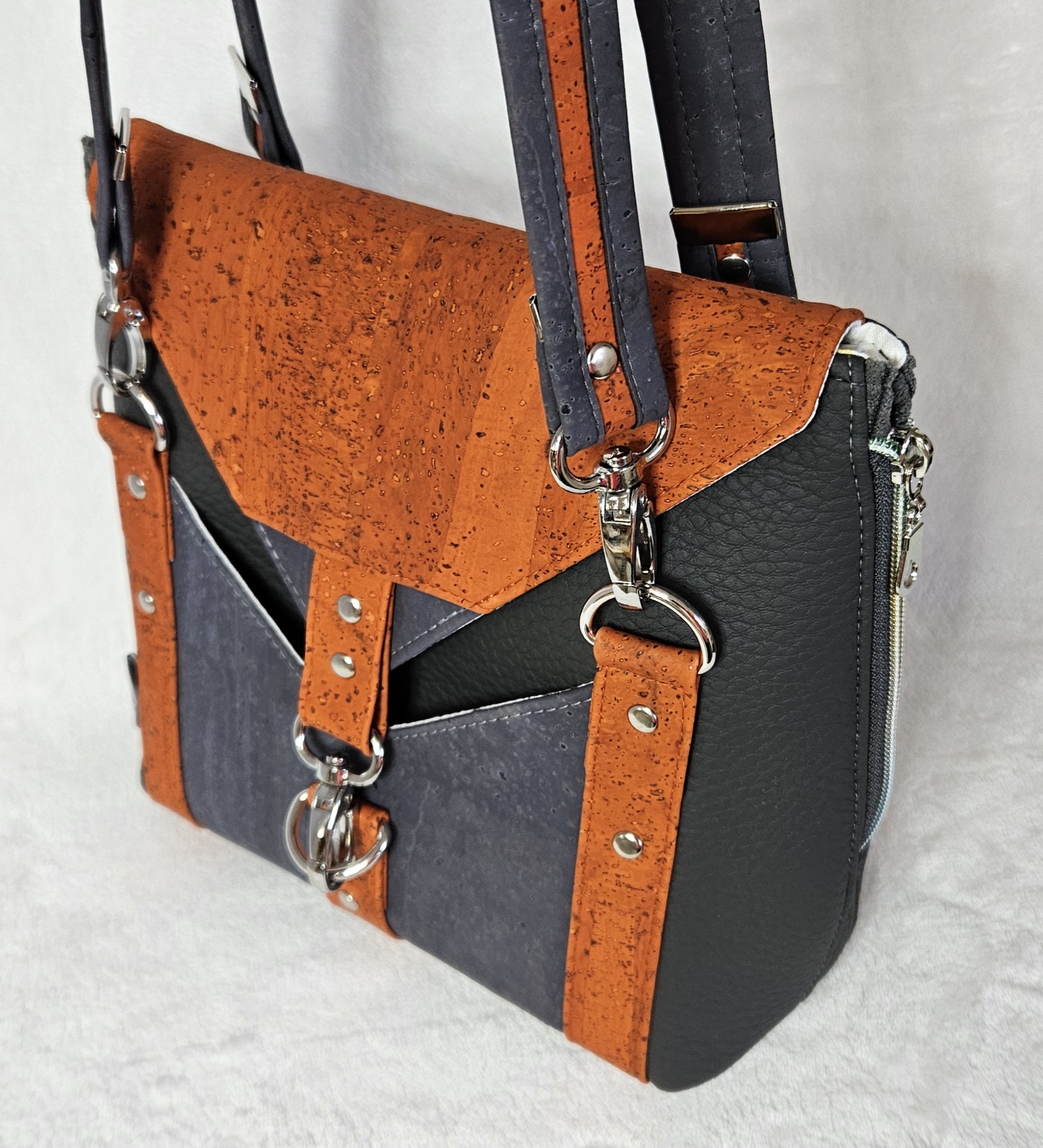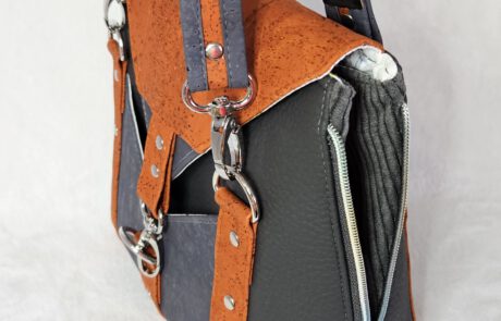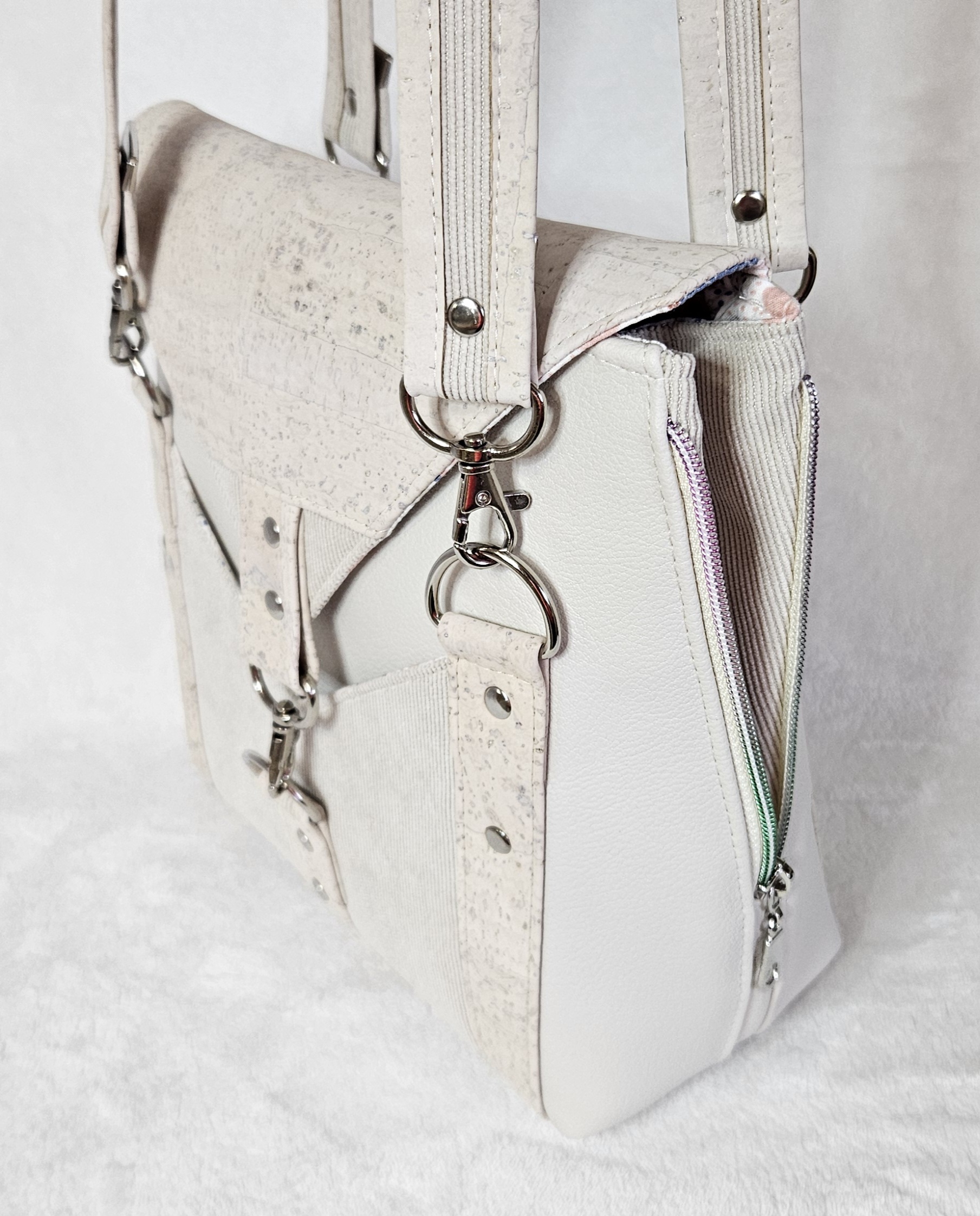 Eine Kombi aus Canvas und Korkstoff. Mit einer Reißverschluss-Blende und einem Magnetverschluß an der Taschenklappe.