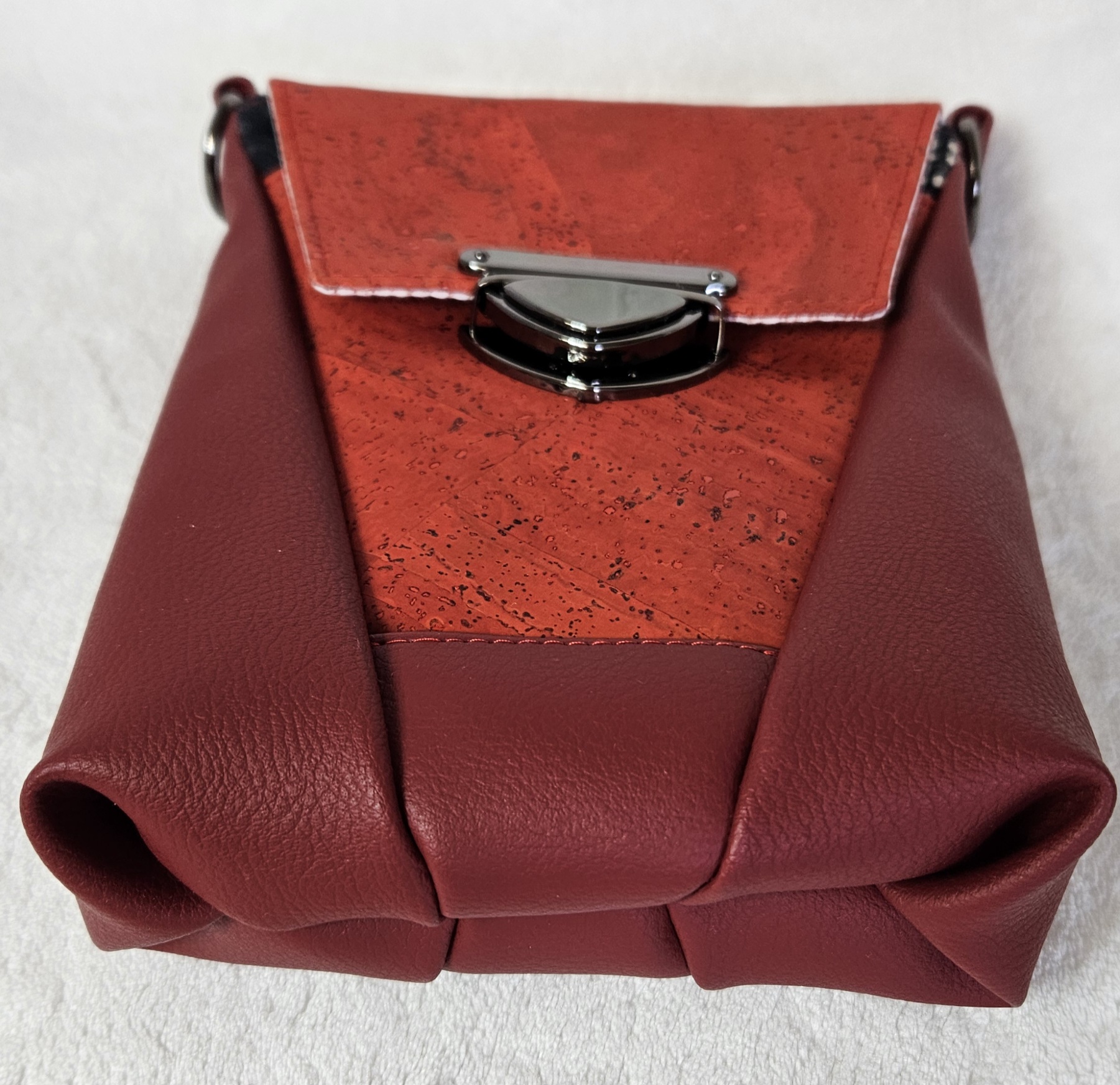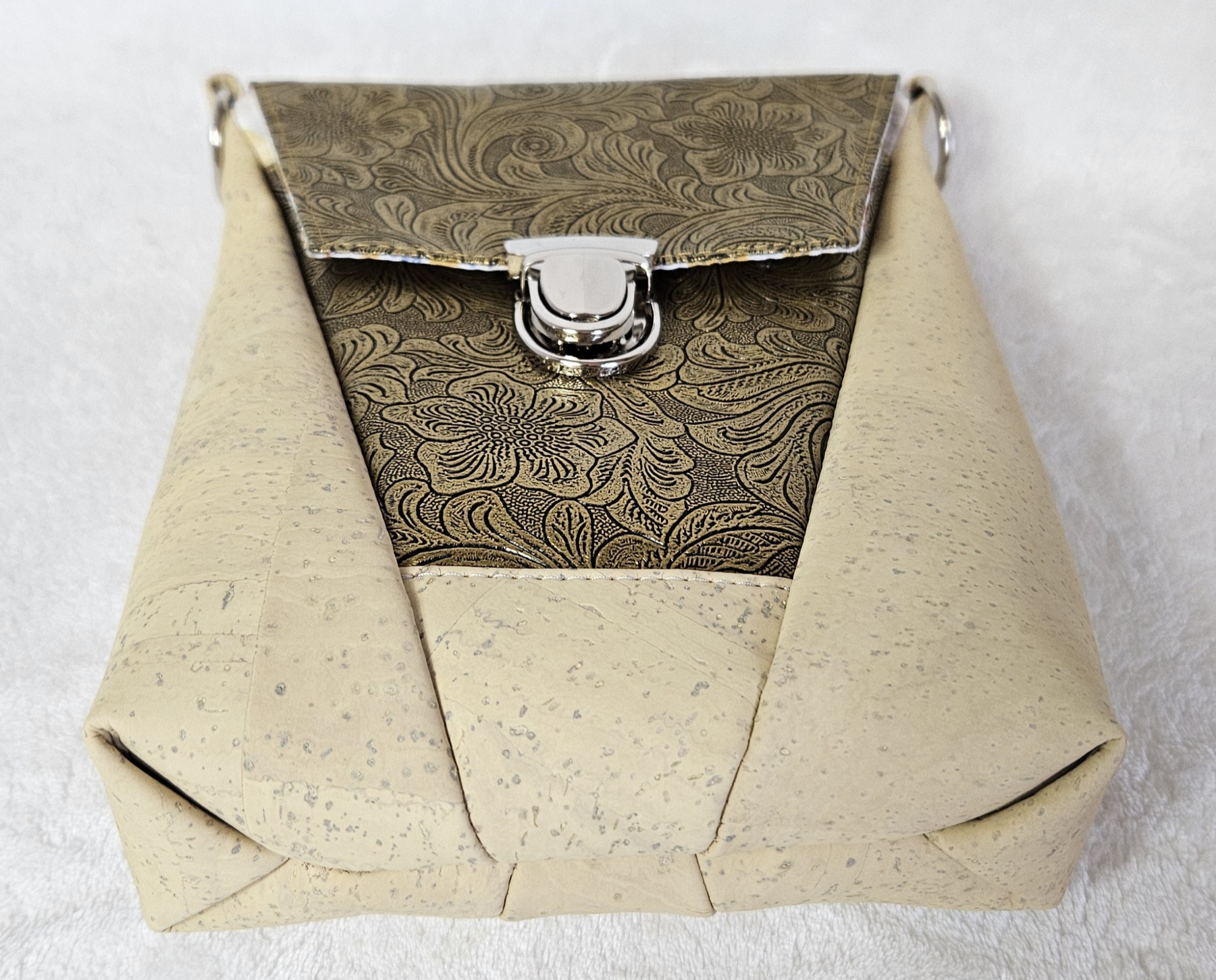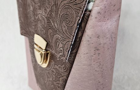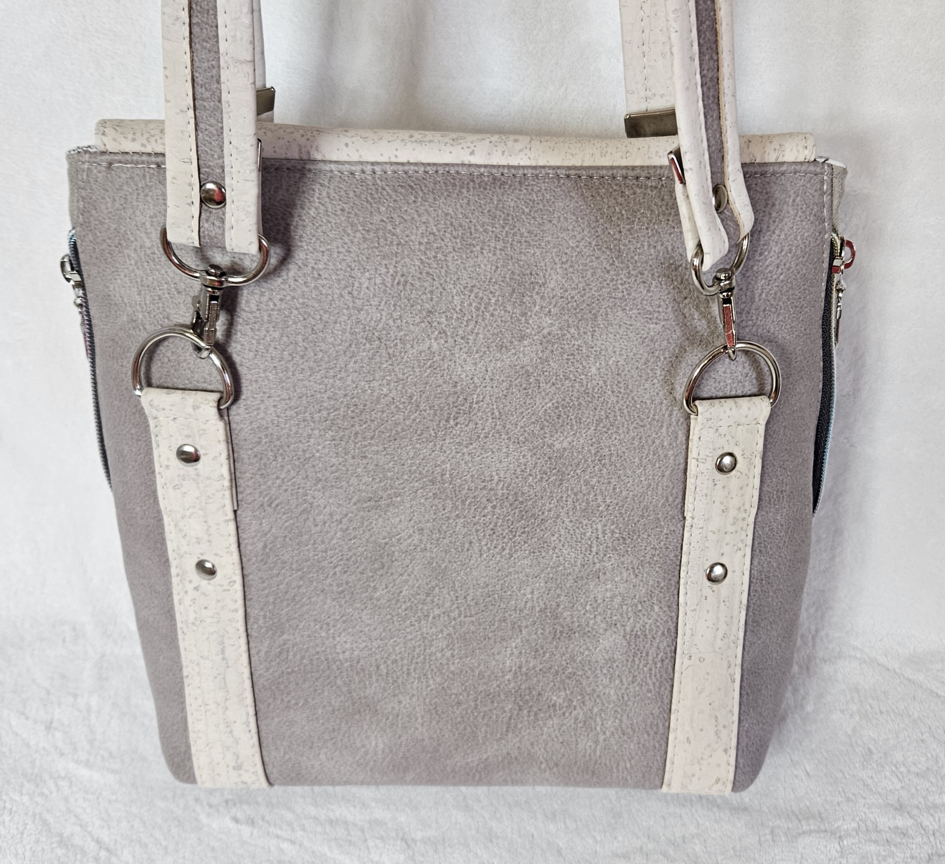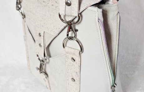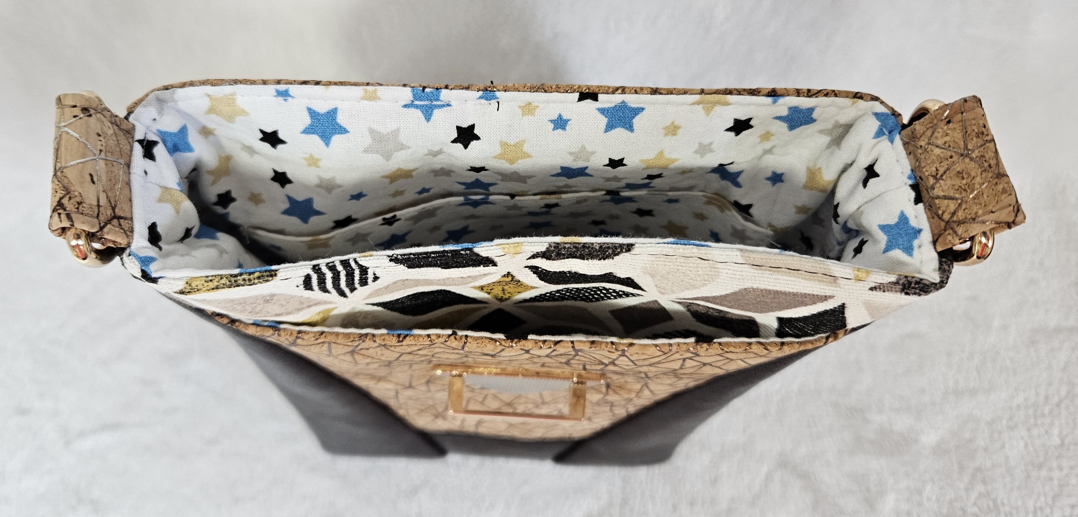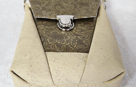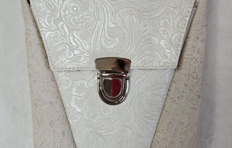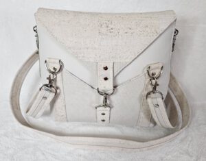 Eine Kombi aus Canvas und Korkstoff. Mit einer Reißverschluss-Blende und einem Magnetverschluß an der Taschenklappe.