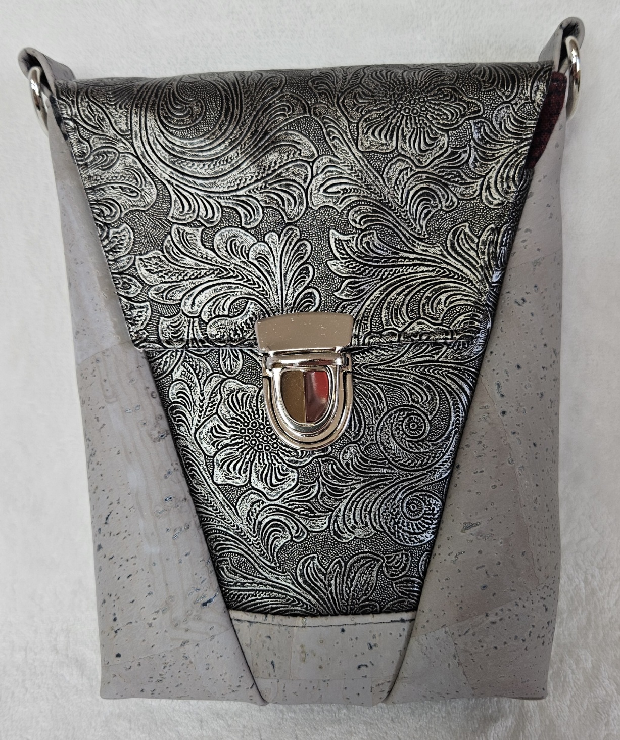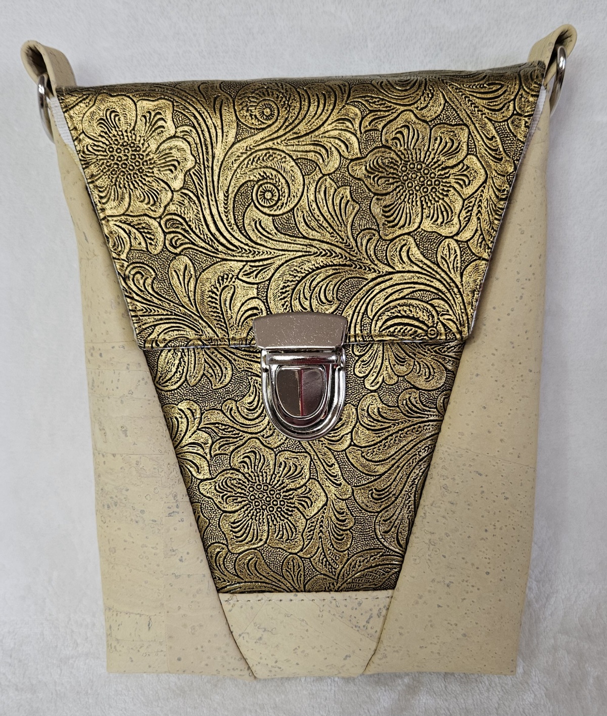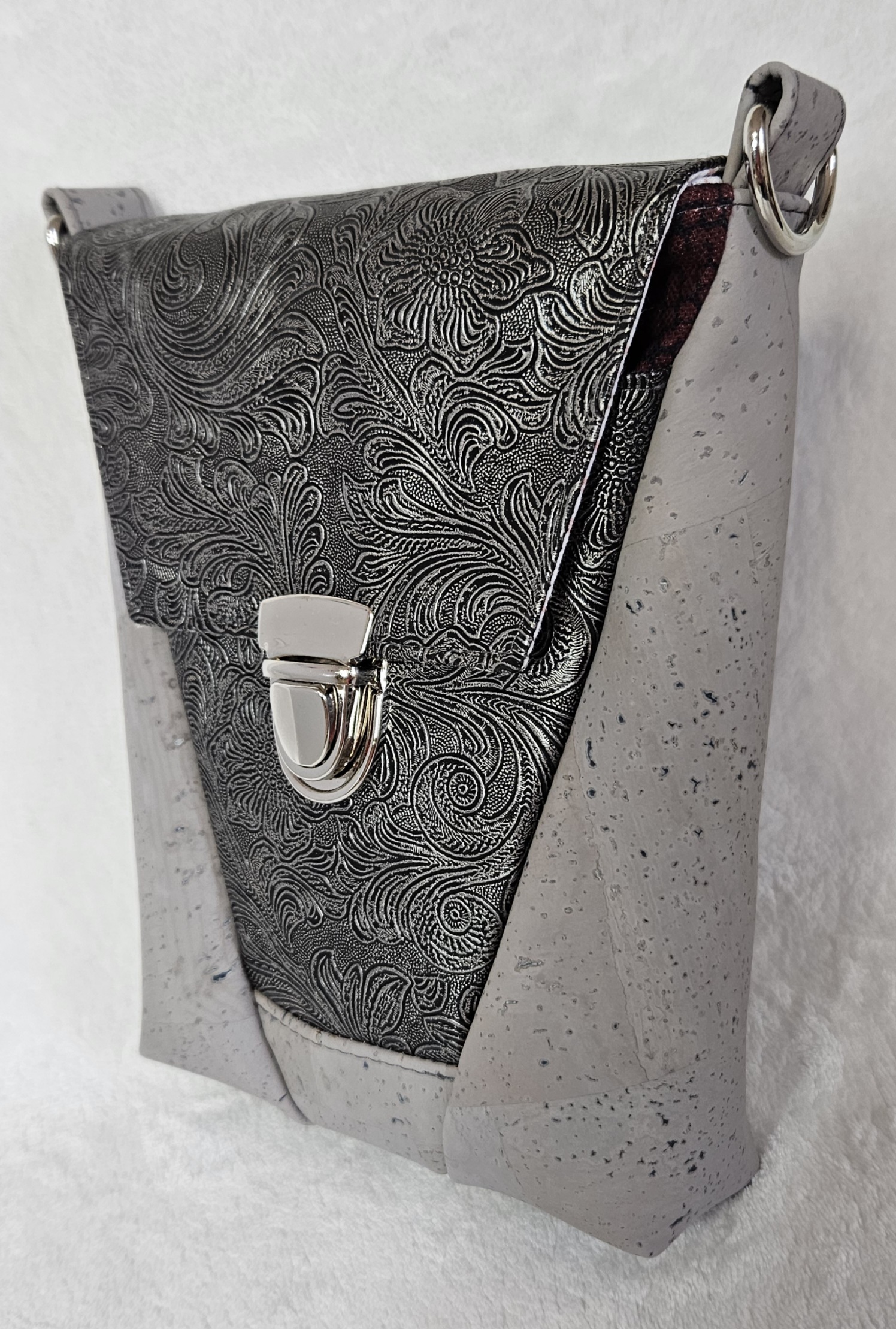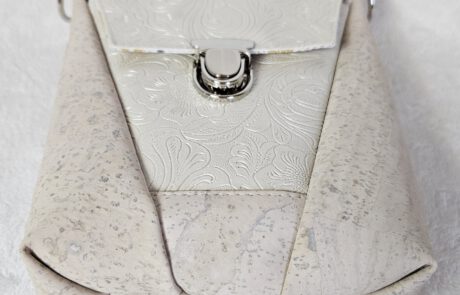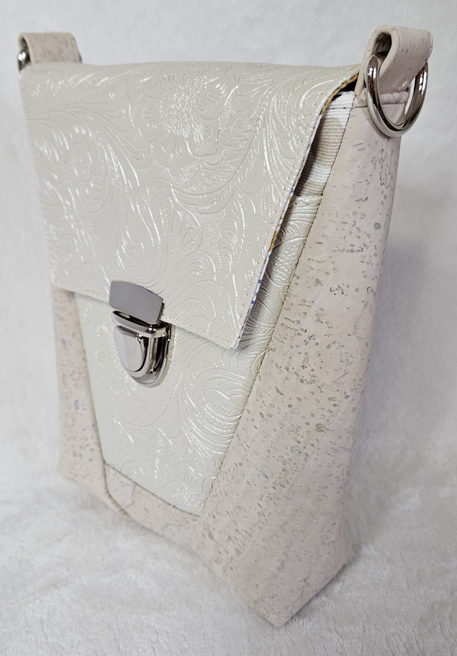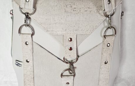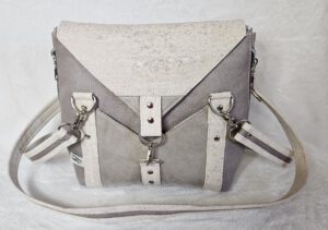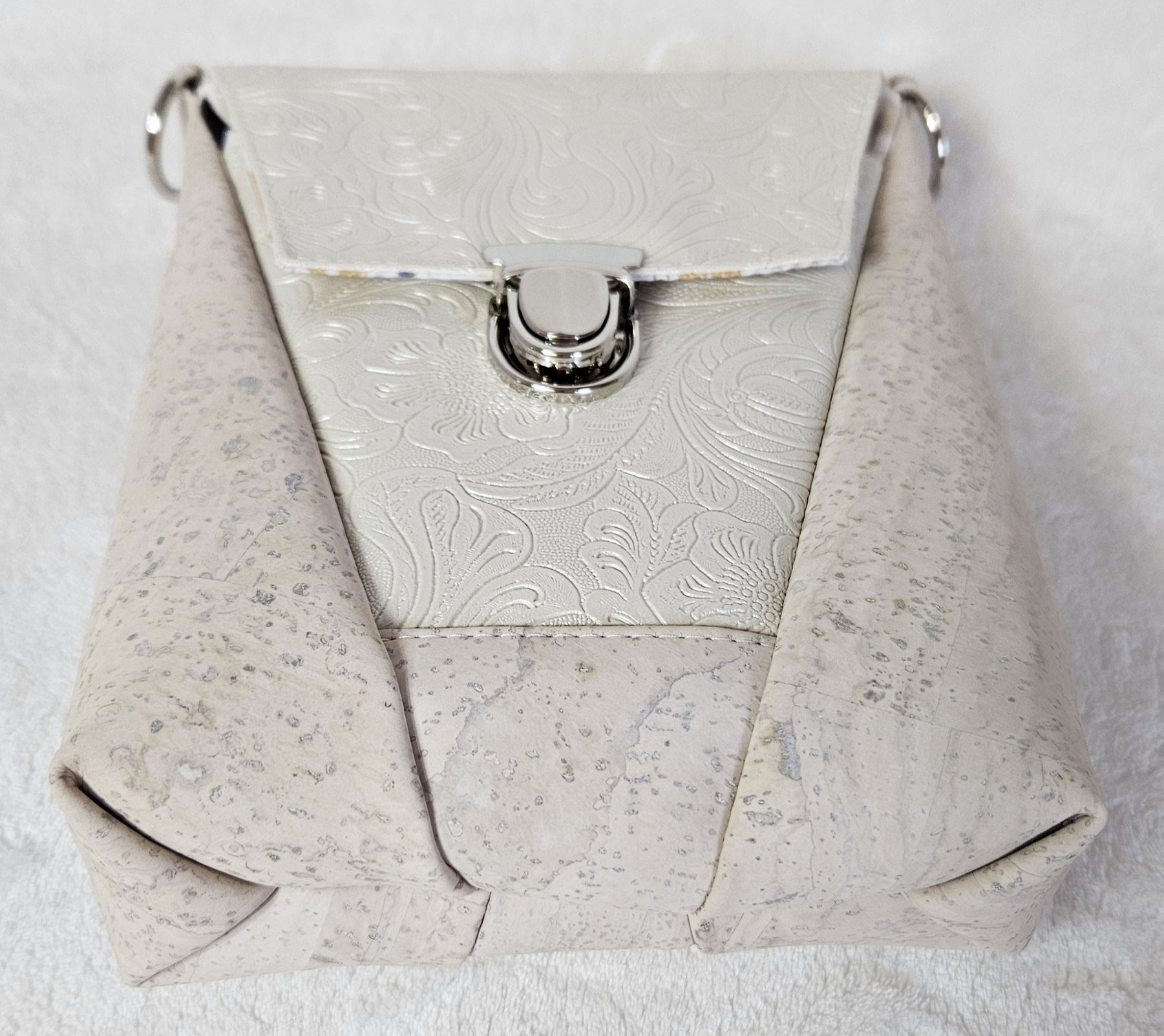 Eine Kombi aus Canvas und Korkstoff. Mit einer Reißverschluss-Blende und einem Magnetverschluß an der Taschenklappe.