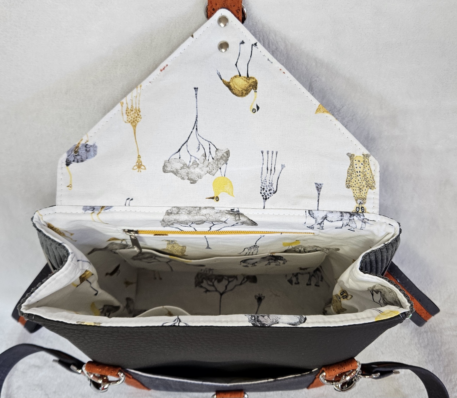 Ein Canvas Außenstoff mit Korkstoff und Kordstoff abgesetzt. Die Innentasche ist auch hier aus Baumwolle.